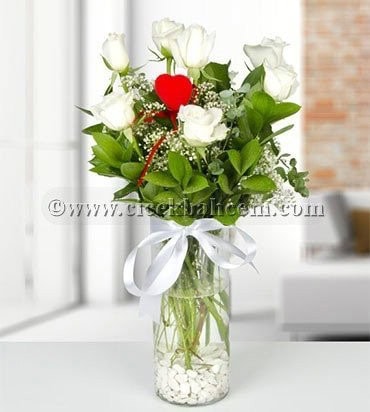 Cam vazo içine 7 adet beyaz gül ve dekoratif taşlarla hazırlanarak sevdiklerinize özel bir hediye . Kalp çubuk ile süslenmiştir.
