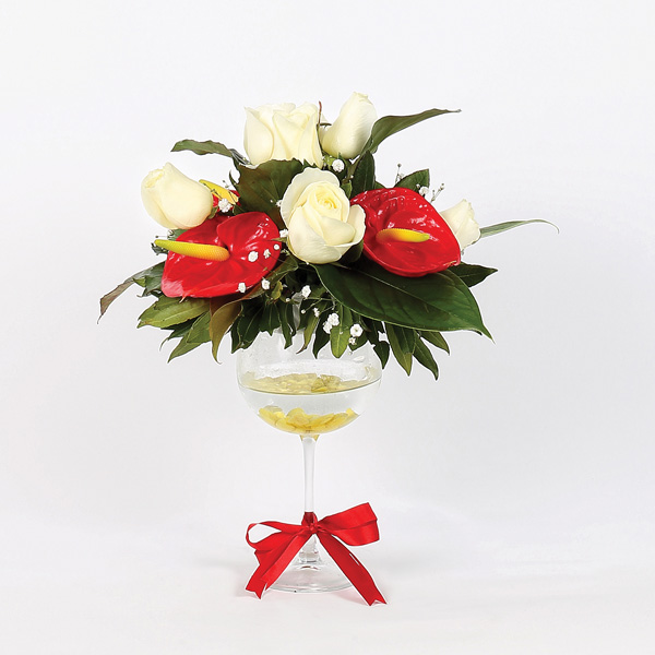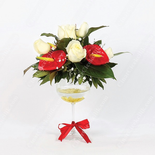 'Bir Kadeh Sevgi' Beyaz Gül Antoryum Aranjmanı. Yaşadığınız bu dünyada seviyor ve seviniyorsanız sizden daha mutlu insan olamaz. İşte bu Sevgiyi bazen kelimelerde ve sözcüklerde ararız. Sözcüklerin bittiği yerde sevdiklerinize en güzel hediye şık kadeh içerisinde Antorium , beyaz Gül çiçeklerinden oluşan şık bir aranjmandır.