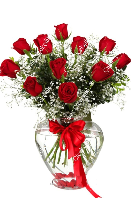 • 11 Adet Beyaz Gül.• Cipsofilya• Cam Kalp Vazo