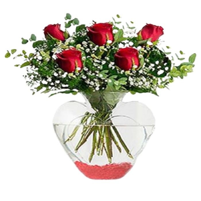 “Kalbim Seninle” Kalp Vazoda 5 Kırmızı Gül