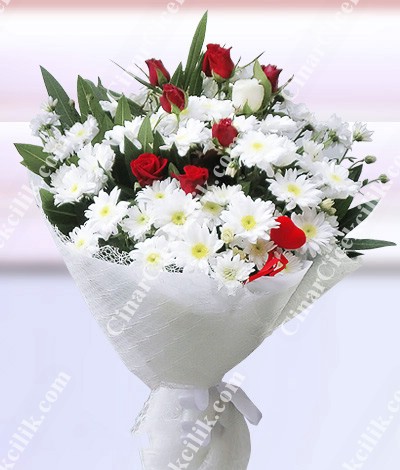 Beyaz tül içinde 7 adet kırmızı gül ve papatya buketi. Birinci kalite kırmızı güller ve papatya ile hazırlanmış bu büyüleyici gül buket, sevdiklerinize hediye ederek onlara güzel bir sürpriz yapabilirsiniz.